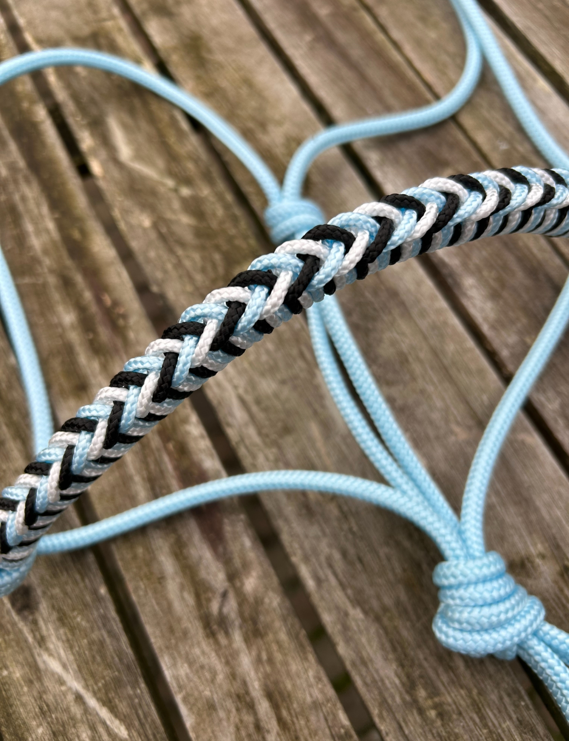 Afwerking: Gevlochten neusband in babyblauw, wit en zwart – stijlvol, speels en uniek