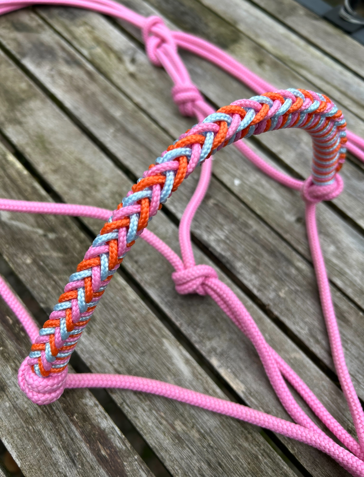 Voeg een zachte en speelse touch toe aan je uitrusting met dit charmante touwhalster in babyroze, afgewerkt met een gevlochten neusband in babyroze, babyblauw en oranje. De frisse, vrolijke kleurencombinatie zorgt voor een lieflijke en tegelijkertijd levendige uitstraling – perfect voor paarden die graag opvallen met een subtiele, kleurrijke flair.