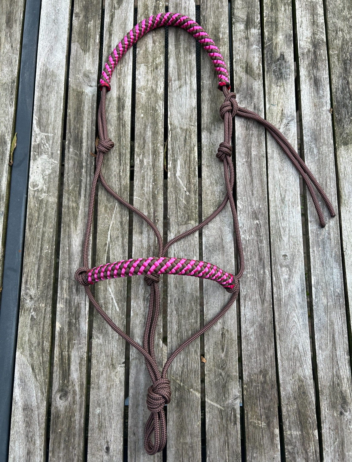 Dit bruine touwhalster met bruin/fuchsia accenten combineert rust met een vleugje pit. Perfect voor ruiters die houden van natuurlijke tinten met een frisse, modieuze twist – of het nu is op stal, tijdens training of bij een fotoshoot.