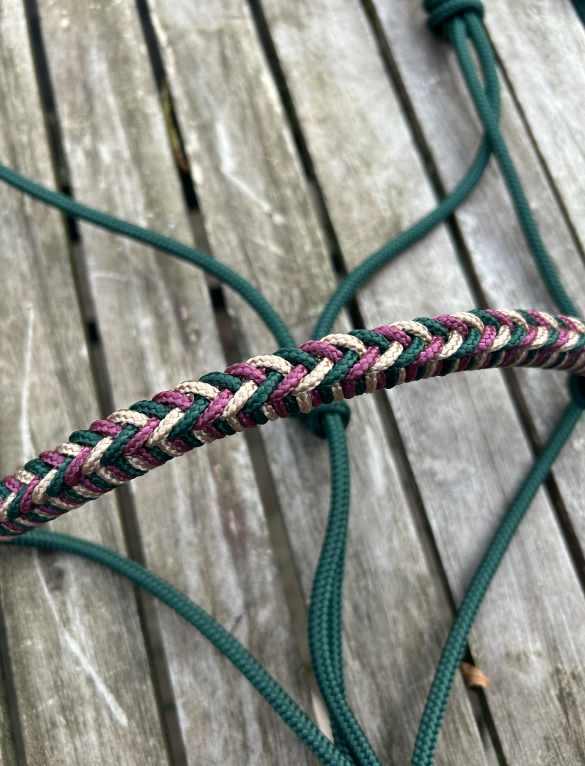 Dit donkergroene touwhalster met gevlochten neusband combineert natuurlijke tinten met een subtiel, elegant accent. Perfect voor ruiters die houden van een klassieke, verfijnde uitstraling – op stal, tijdens training of bij een fotoshoot.