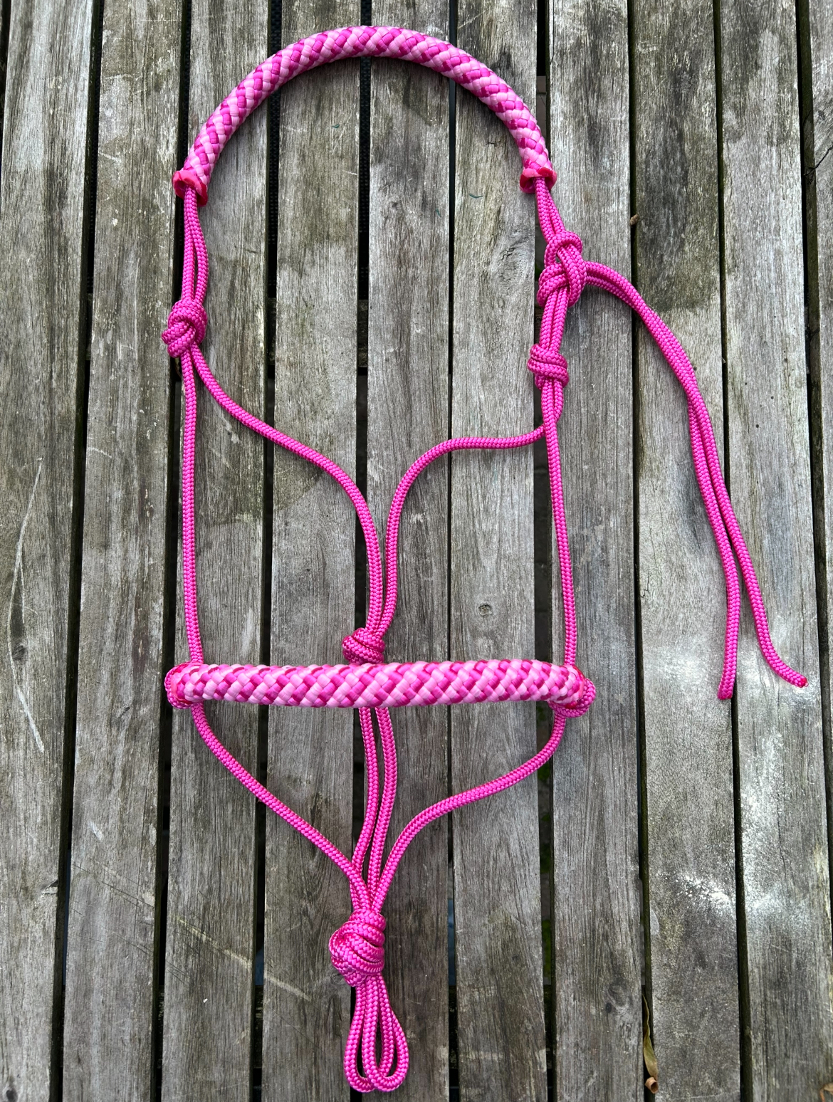 Geef je uitrusting een vrolijke en stijlvolle upgrade met dit touwhalster in fuchsia, afgewerkt met een fuchsia/babyroze gevlochten neus- en oorband. De speelse combinatie van heldere en zachte tinten zorgt voor een levendige, maar toch elegante uitstraling – perfect voor paarden die graag een beetje extra flair uitstralen.