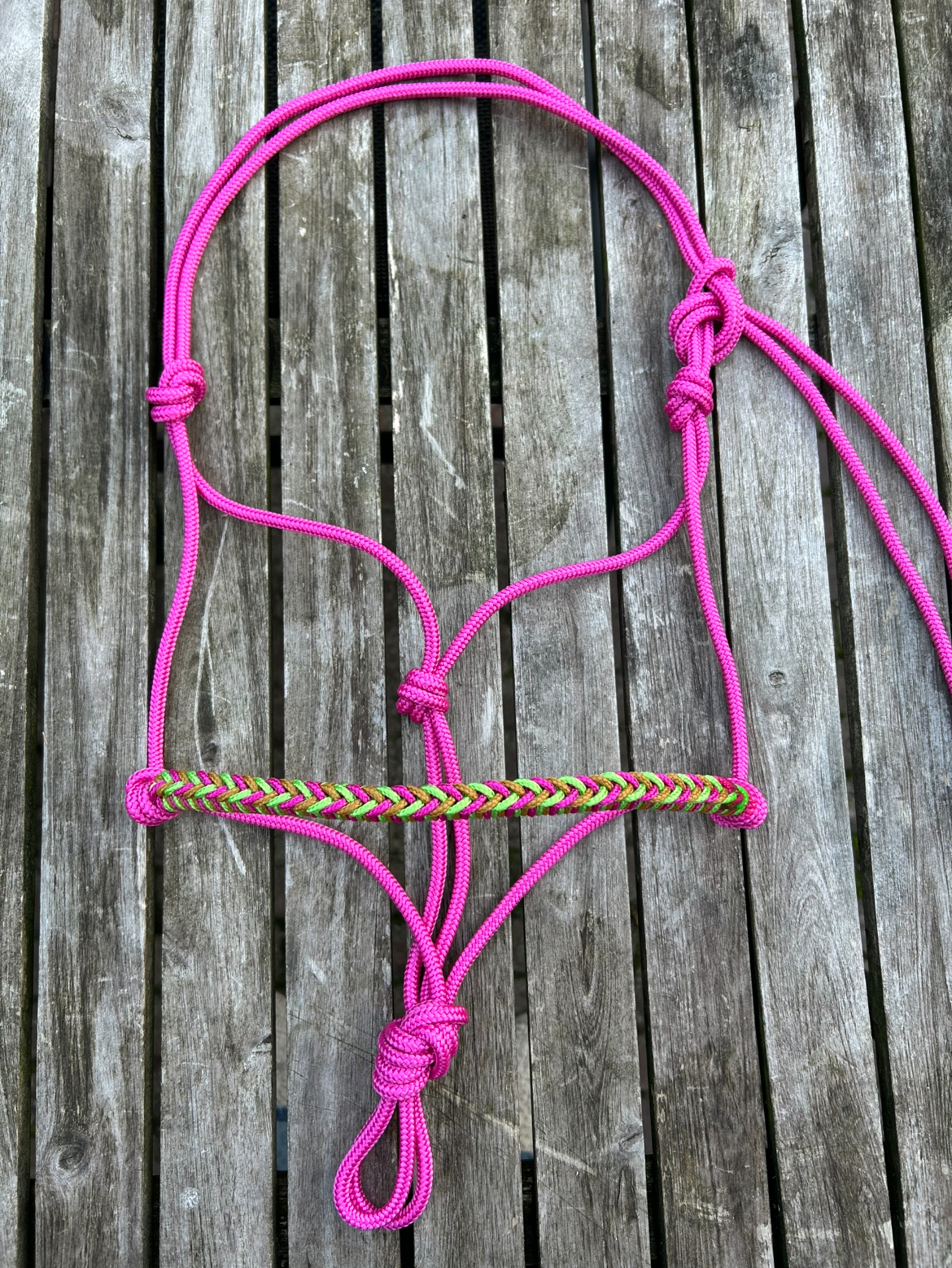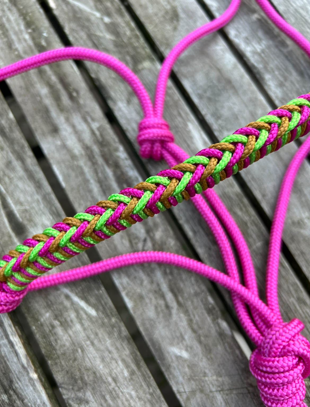 Laat je paard stralen met dit touwhalster in fuchsia, afgewerkt met een handgevlochten neusband in fuchsia, karamel en appeltjesgroen. De opvallende kleurencombinatie zorgt voor een speelse en frisse uitstraling met een warme twist – perfect voor paarden die gezien mogen worden.