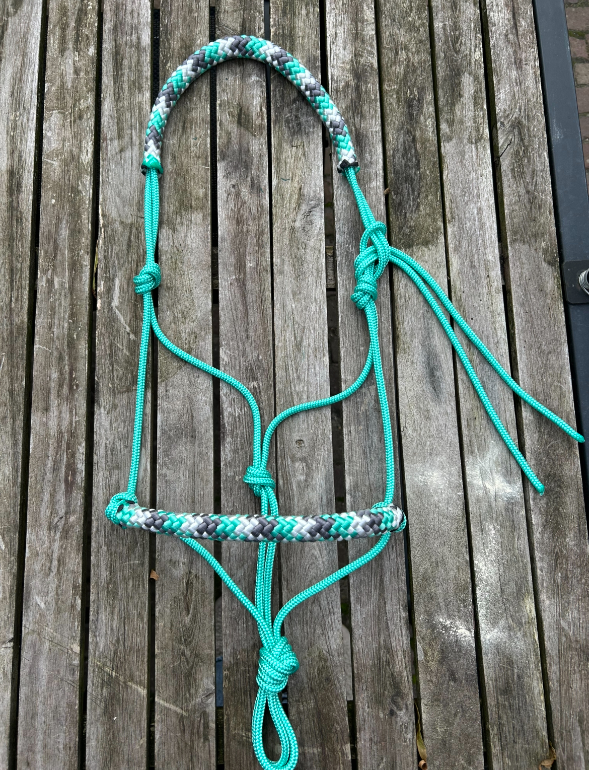 Breng een frisse, moderne look in je uitrusting met dit stijlvolle touwhalster in mintgroen, afgewerkt met een mintgroene camouflage neus- en oorband. De zachte, verfrissende kleur gecombineerd met het subtiele camouflagedetail geeft het halster een eigentijdse en sportieve uitstraling – perfect voor paarden die graag in stijl verschijnen.