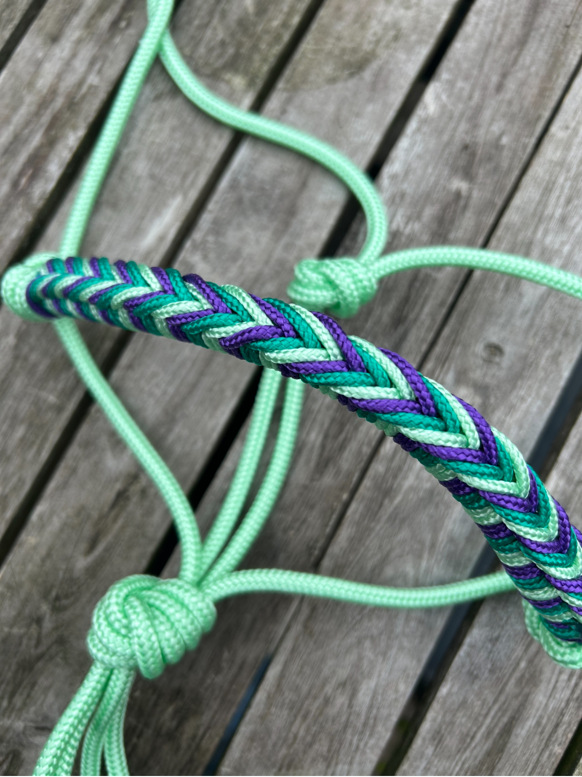 Breng een frisse, verfijnde uitstraling in je uitrusting met dit zachte touwhalster in pastel mint, afgewerkt met een dubbel gevlochten neusband in pastel mint, smaragd groen en paars. De lichte, verfrissende basiskleur gecombineerd met de levendige, contrasterende accenten geeft het halster een elegante en speelse uitstraling – perfect voor paarden die subtiel willen opvallen met kleur.