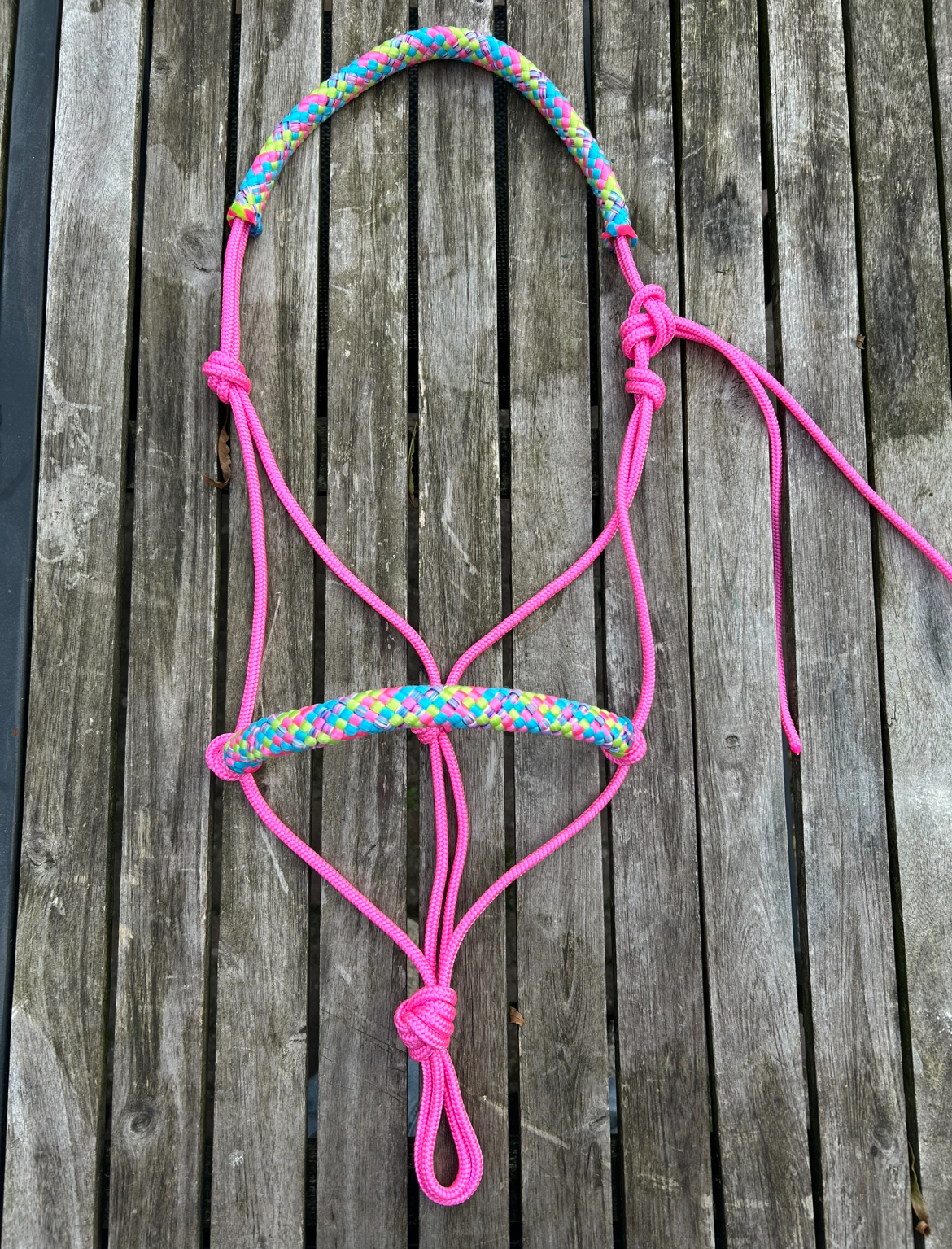 Voeg een tropisch tintje toe aan je uitrusting met dit vrolijke touwhalster in roze, afgewerkt met een gevlochten neus- en oorband in Hawaii Mix kleuren. De speelse combinatie van frisse, zomerse tinten met het levendige roze zorgt voor een zonnige, vrolijke uitstraling – perfect voor paarden die mogen stralen met een vakantiegevoel.