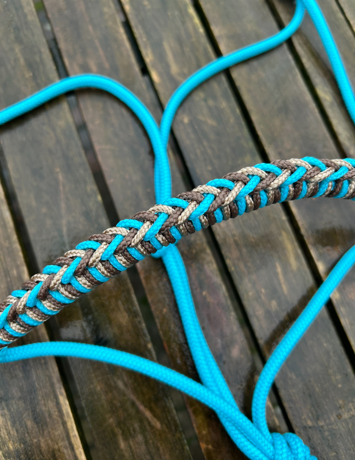 Dit turquoise touwhalster met gevlochten neusband combineert frisheid met natuurlijke warmte. Perfect voor ruiters die houden van een elegante, subtiele en stijlvolle uitstraling – op stal, tijdens training of bij een fotoshoot.